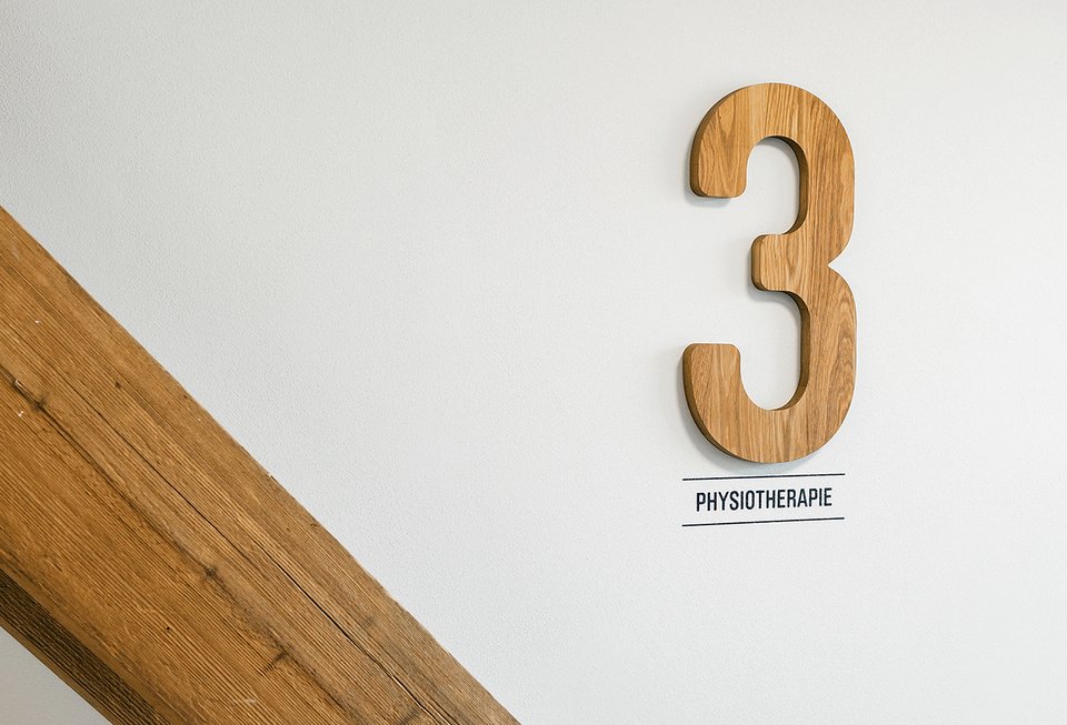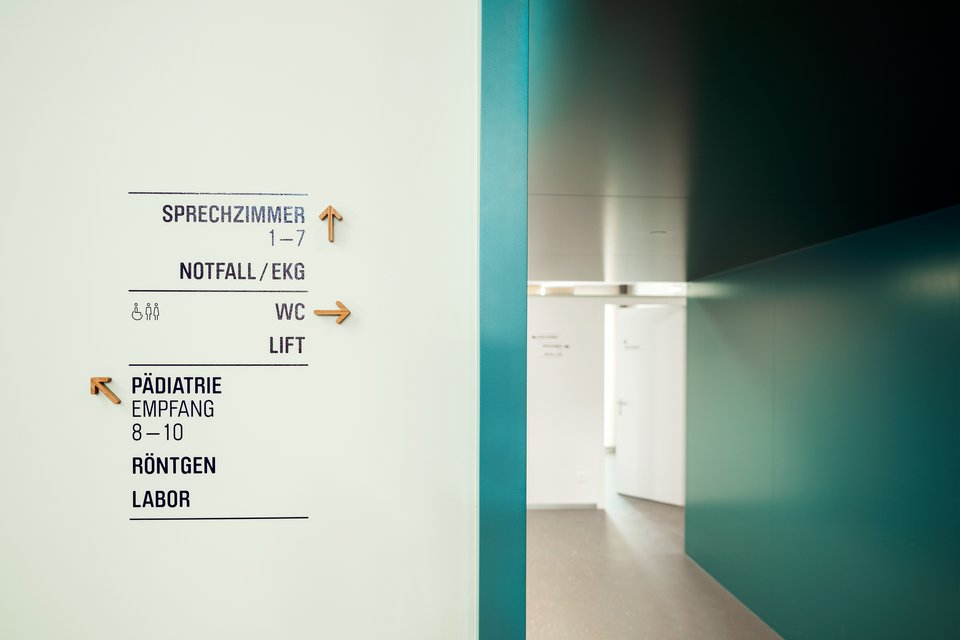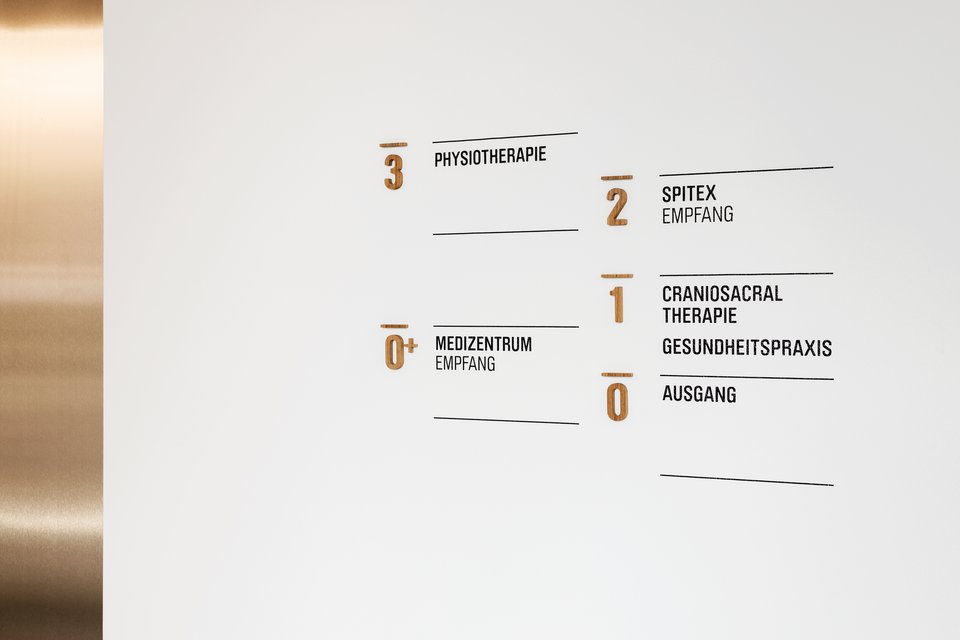 Infolge der umfassenden Sanierung des ehemaligen Landhauses im Zentrum von Steffisburg 2019 wird das denkmalgeschützte Gebäude neu als Gesundheitszentrum umgenutzt. Der bestehende Kopfbau wird um einen Anbau ergänzt. Die Komplexität der Gebäudestruktur – es gibt mehrere Zwischenstöcke – erfordert eine klares Wegführungskonzept. durchzwei entwickelt in Zusammenarbeit mit der Gemeinde, dem Architekten und der Denkmalpflege des Kantons Bern ein auf die Architektur abgestimmtes Signaletik-Konzept. Holz und Metall prägen die Materialität, die Schrift ist klar und lesbar und die neuralgischen Punkte weisen den Weg.
