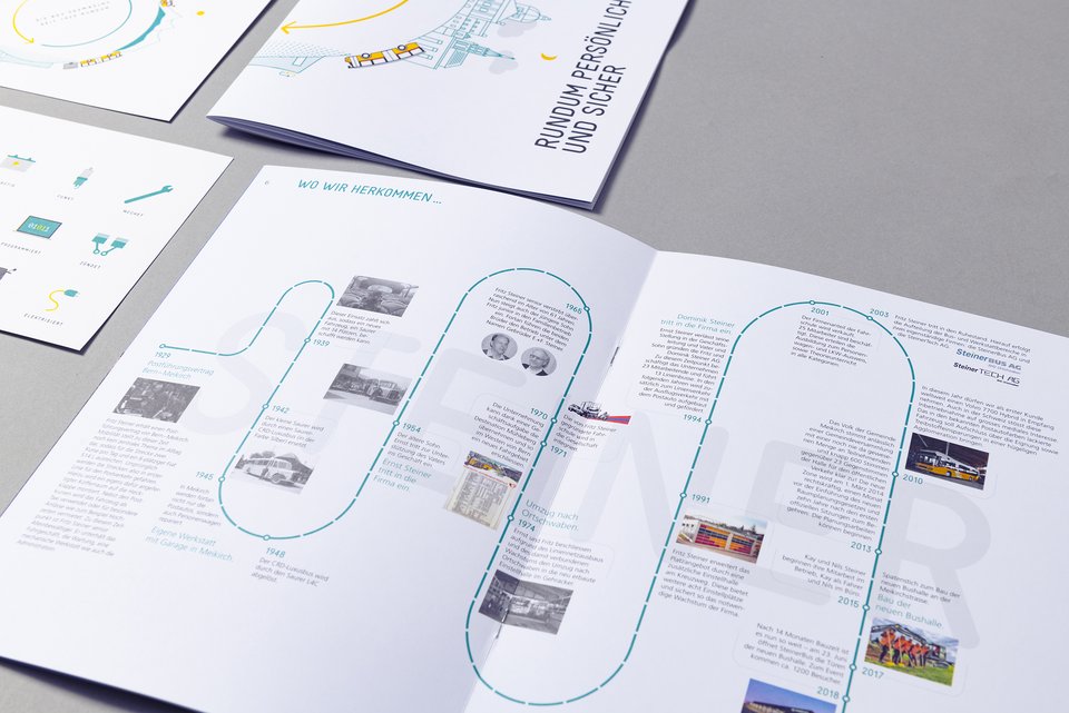 Ein privater Transporteur im Raum Bern-Nord und Bern-West namens Steiner Bus AG und die SteinerTECH AG, führend in Reparatur von Postmobilen, zementieren 2015 ihre Zusammenarbeit mit einem einheitlichen visuellen Auftritt. Um die unter einem Dach operierenden Unternehmen grafisch zu vereinheitlichten, entwickelt durchzwei eine eigene Schrift. Das SteinerBUS-Logo spiegelt den Kreislauf wieder, den die Kunden täglich sicher von Zuhause zur Arbeit und zurück bringt.