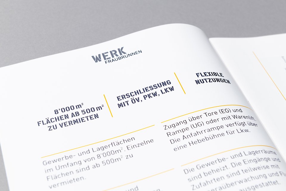 Eine ehemalige Möbelfabrik wird umgebaut zu individuellen Gewerberäumen. Die Hallen erhalten den Namen «WERK Fraubrunnen». Für die Vermarktung kreiert durchzwei das Branding. Das Design leitet sich von alten Beschriftungen und grafischen Elementen sowie von Markierungen der bestehenden Industrieböden ab. Die Stencil-Schrift in Kombination mit der DIN versprüht den industriellen Charme der ehemaligen Fabrikhallen. durchzwei ist zudem verantwortlich für die Gestaltung der Vermarktungstools vom überzeugenden kommunikativen Auftritt bis hin zur Signaletik und Wegführung. www.werk-fraubrunnen.ch